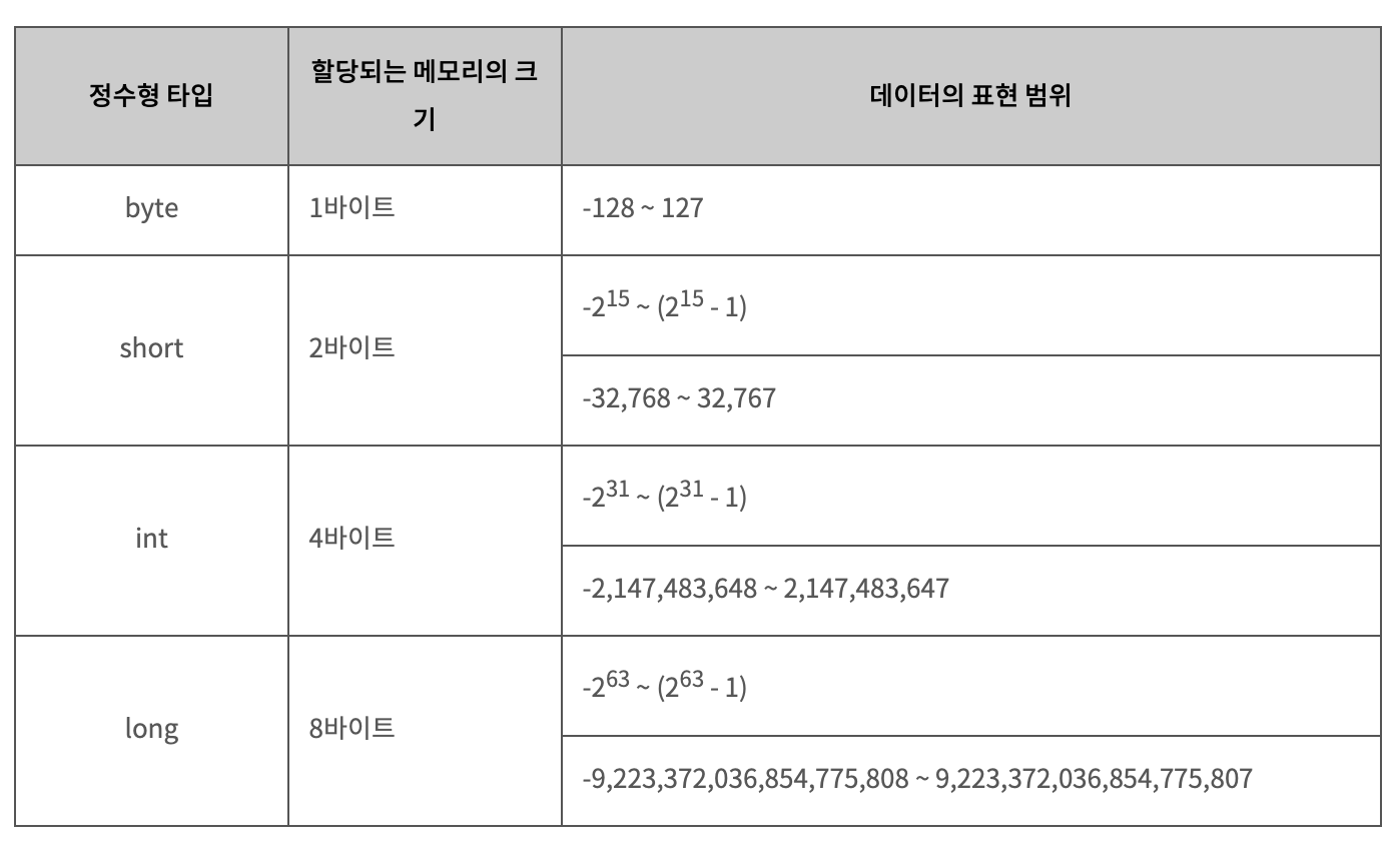 자바에서는 여러 형태의 타입을 미리 정의하여 제공하는데, 이것을 기본타입 이라고 한다.