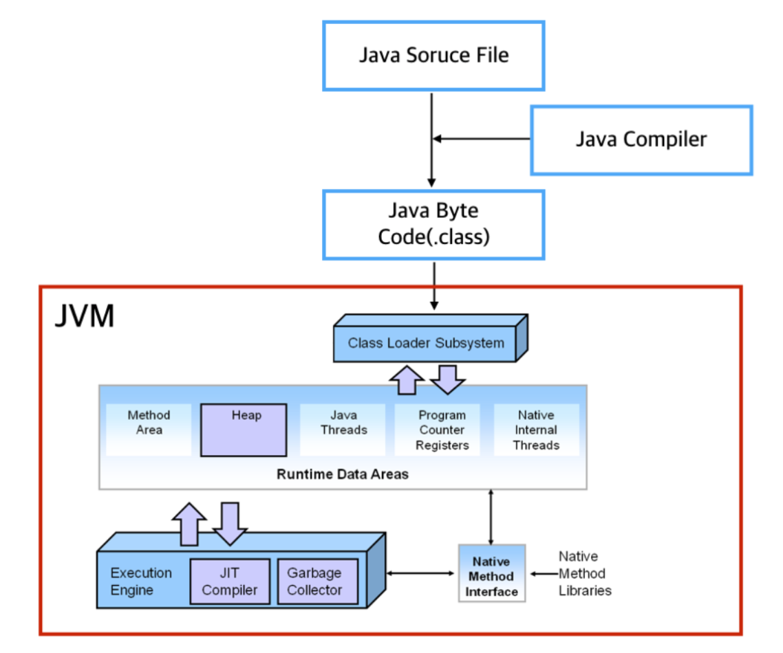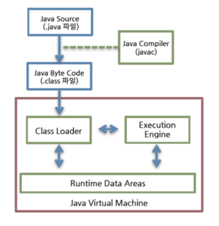 Java 소스 코드는 javac 컴파일러를 거쳐 바이트코드로 변환되며, 이 바이트코드는 JRE에 들어있는 java classloader에 의해 JVM으로 적재되고 JVM은 적재된 바이트코드를 JIT 컴파일 방식으로 실행한다.