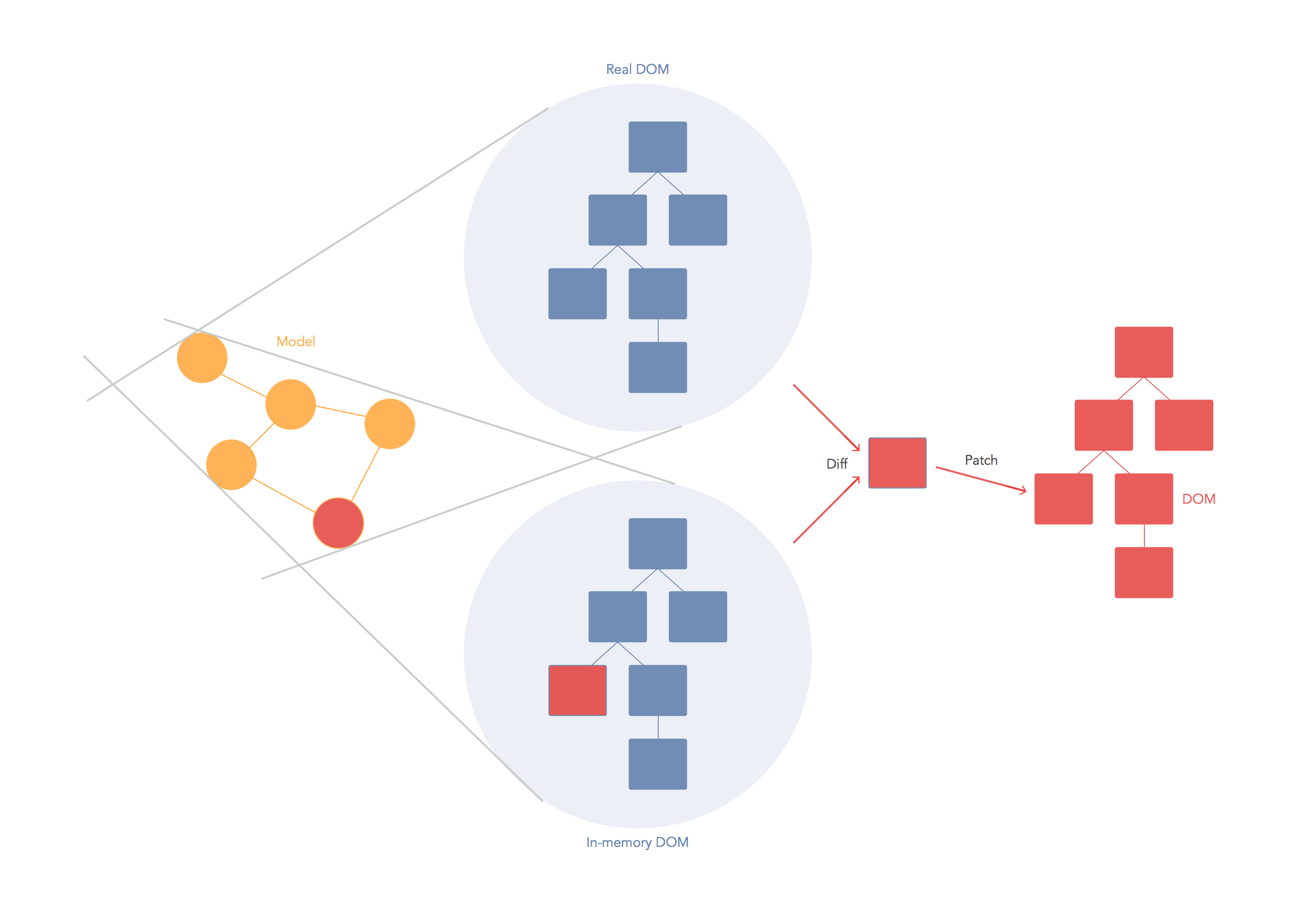 https://react.vlpt.us/basic/01-concept.html 그리고 나서 리액트 개발팀이 만든 매우 효율적인 비교 알고리즘을 통하여 실제 브라우저에 보여지고 있는 DOM 과 비교를 한 후, 차이가 있는 곳을 감지하여 이를 실제 DOM 에 패치시켜준다. 이를 통하여, "업데이트를 어떻게 할 지" 에 대한 고민을 하지 않으면서, 빠른 성능도 지켜낼 수 있게 되었다.