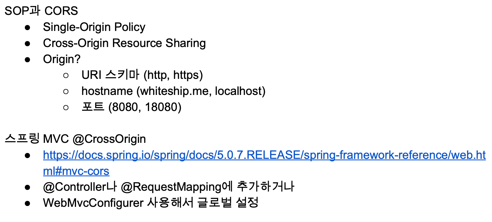 ex) http://localhost:8080 에 실행중인 앱에서 https:localhost:18080 서버로 리소스 요청을 할 수 없다.