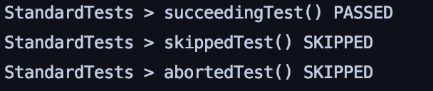 class StandardTests { @BeforeAll static void initAll() { } @BeforeEach void init() { } @Test void succeedingTest() { } // @Test // void failingTest() { // fail("a failing test"); // } @Test @Disabled("for demonstration purposes") void skippedTest() { // not executed } @Test void abortedTest() { assumeTrue("abc".contains("Z")); fail("test should have been aborted"); } @AfterEach void tearDown() { } @AfterAll static void tearDownAll() { } }