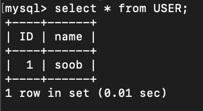 MysqlRunner를 만들어 실행후 터미널에서 확인시 제대로 저장된 것을 볼 수 있다.