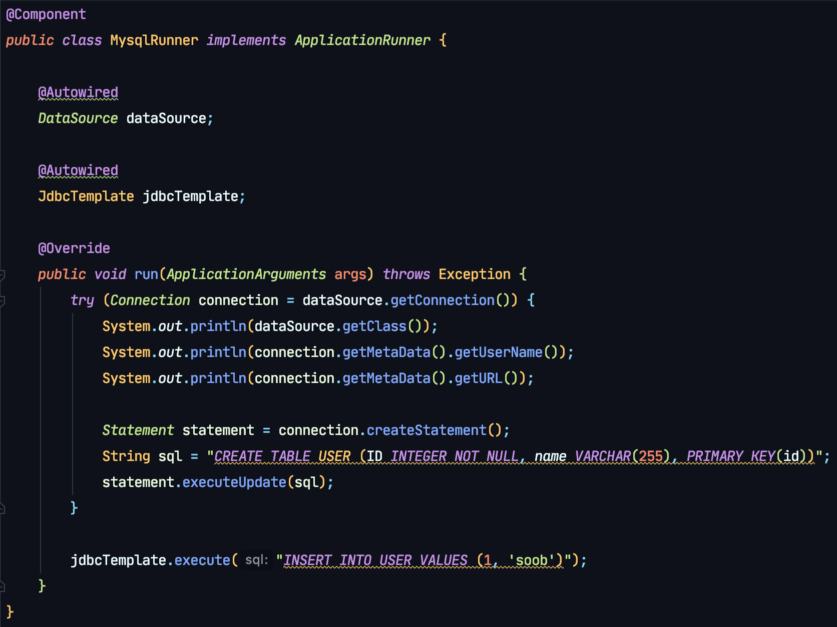 MysqlRunner를 만들어 실행후 터미널에서 확인시 제대로 저장된 것을 볼 수 있다.