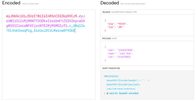 - 각각 헤더는 토큰 타입과 해싱 알고리즘, 내용은 실제 전달할 정보, 서명에는 위변조를 방지하기 위한 값이 들어가 있음
