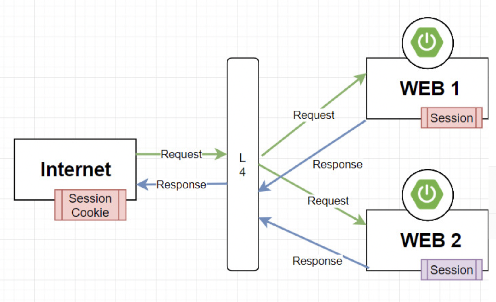 - 위와 같이 트래픽을 분산하여 두 대의 서버에 호출하게되면 각각의 웹 서버에서는 관리하는 세션 정보를 서로 공유하고 있지 않다.