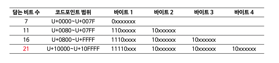 - 코드 포인트의 범위: 0 ~ 10FFFF(16) (21비트)
