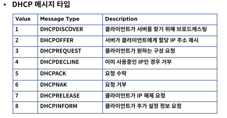 - Client IP: 최초 0.0.0.0, Your IP: 할당될 IP, Options: DHCP 메시지 타입 포함