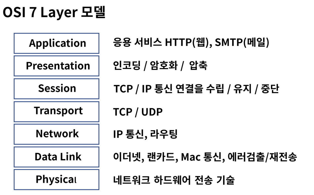 - 네트워크 프로토콜과 통신을 7 계층으로 표현