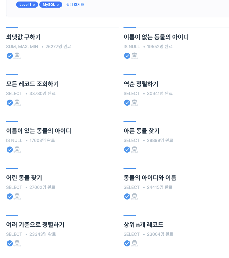 MySQL 1레벨 다 풀었다.PS/programmers 2021. 8. 6. 11:01