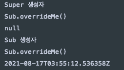 // Super.java public class Super { public Super() { System.out.println("Super 생성자"); overrideMe(); } public void overrideMe() { System.out.println("Super.overrideMe()"); } } // Sub.java public final class Sub extends Super { private final Instant instant; Sub() { System.out.println("Sub 생성자"); instant = Instant.now(); } @Override public void overrideMe() { System.out.println("Sub.overrideMe()"); System.out.println(instant); } public static void main(String[] args) { Sub sub = new Sub(); sub.overrideMe(); } }