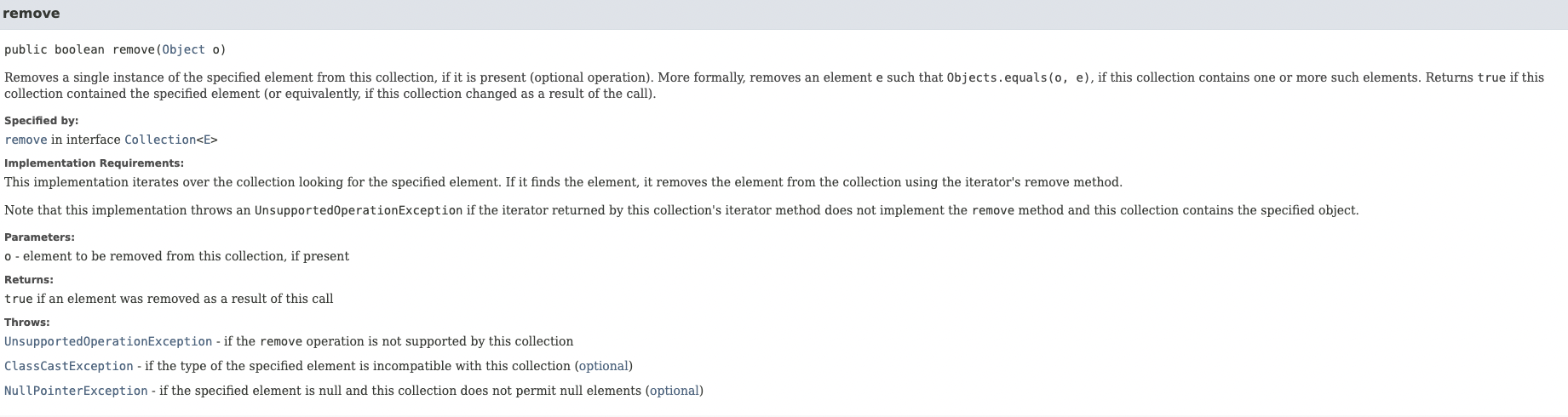 // AbstractCollection.java /** * {@inheritDoc} * * @implSpec * This implementation iterates over the collection looking for the * specified element. If it finds the element, it removes the element * from the collection using the iterator's remove method. * * <p>Note that this implementation throws an * {@code UnsupportedOperationException} if the iterator returned by this * collection's iterator method does not implement the {@code remove} * method and this collection contains the specified object. * * @throws UnsupportedOperationException {@inheritDoc} * @throws ClassCastException {@inheritDoc} * @throws NullPointerException {@inheritDoc} */ public boolean remove(Object o) { // ... }AbstractCollection의 remove를 보면 자바독 주석에 @ImplSpec ... 이라고 나와있는데 이 부분이 자바 API 문서에 들어가보면 아래와 같이 적혀있다.