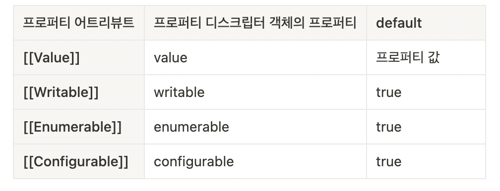 - 프로퍼티 디스크립터 객체에서 생략된 어트리뷰트의 기본값