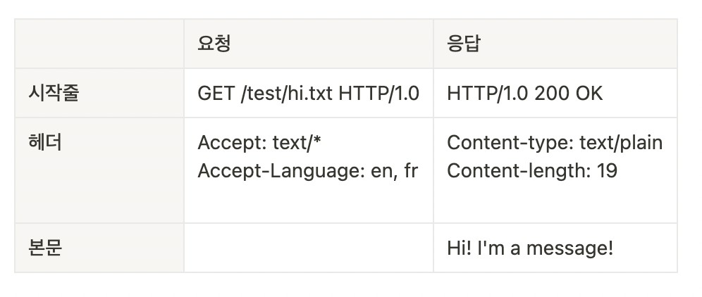 본문: 요청의 본문은 웹 서버로 데이터를 실어 보내며, 응답의 본문은 데이터를 반환한다. 본문은 임의의 이진 데이터를 포함할 수 있다. (이미지, 비디오, 오디오, 응용 소프트웨어)