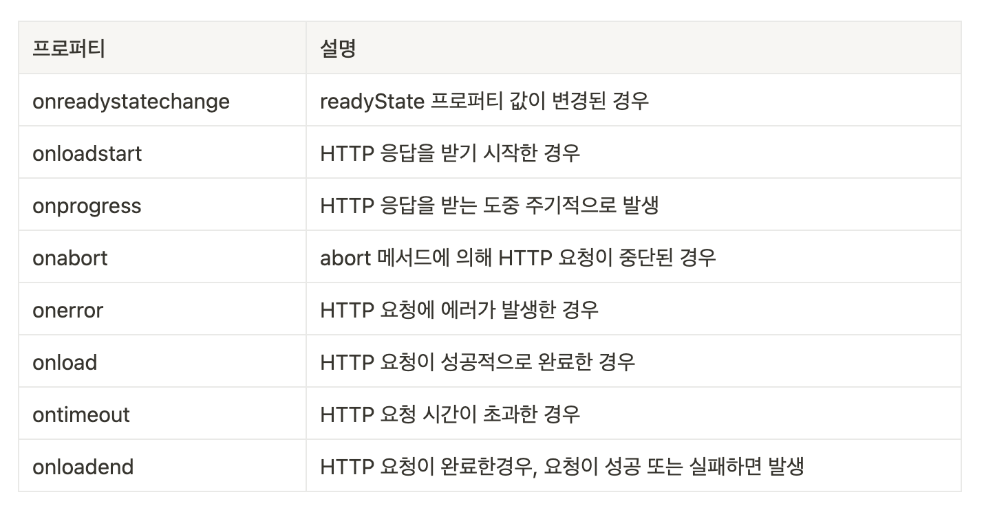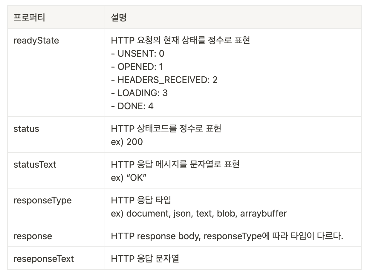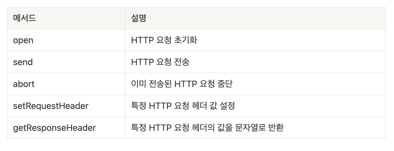 - Web API인 XMLHttpRequest 객체는 HTTP 요청전송, 응답수신을 위한 다양한 메서드와 프로퍼티를 제공한다.