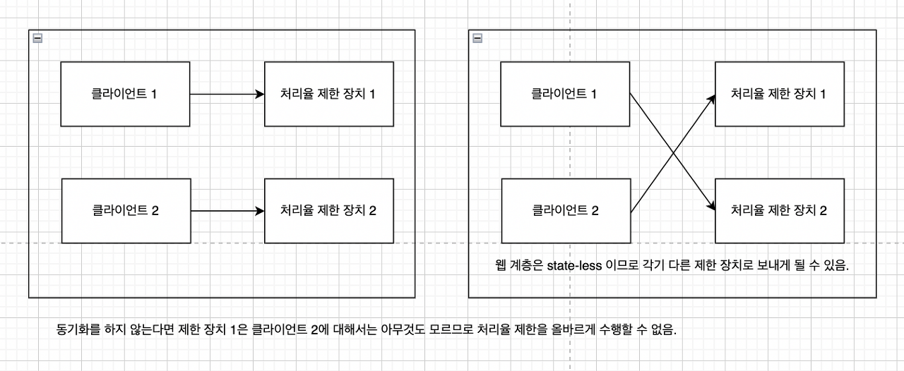 - 수백만 사용자를 지원하려면 처리율 제한 장치 서버를 여러 대 두게 될 수 있는데 이때 동기화가 필요해진다.