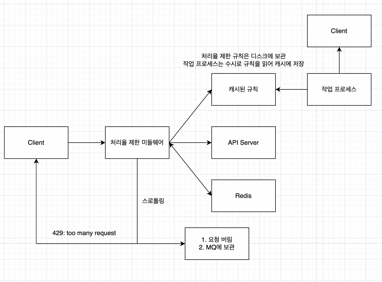 - 클라이언트 요청은 쉽게 위변조가 가능하여 클라이언트는 처리율 제한을 안정적으로 걸 장소가 못 된다.