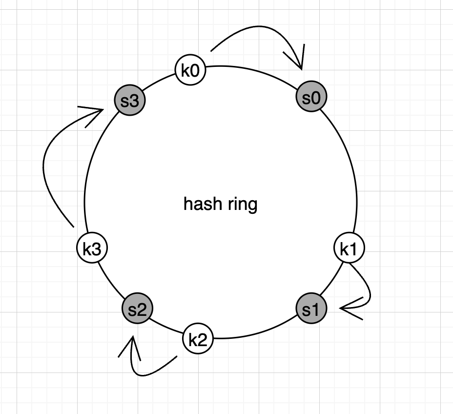어떠한 키가 저장되는 서버는, hash ring에서 해당 키 위치로부터 시계 방향으로 링을 탐색해 나가면서 만나는 첫 번째 서버다.