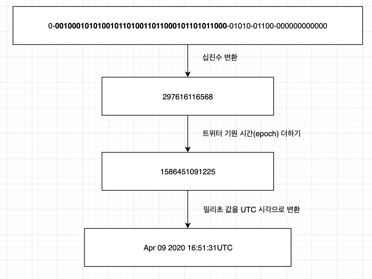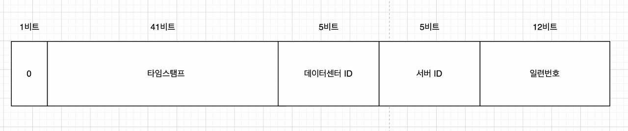타임스탬프(timestamp): 41비트 할당. 기원 시간(epoch) 이후로 몇 밀리초가 경과했는지 나타내는 값이다.