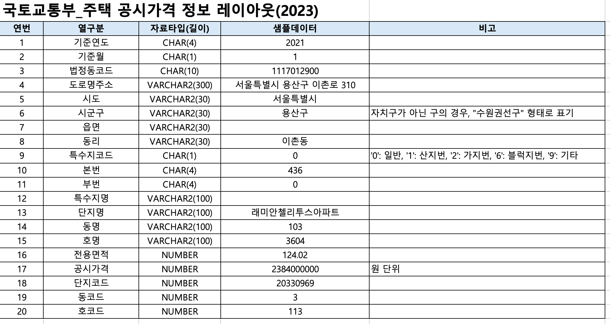 공시가격 정보 데이터는 위의 형식과 같아요.