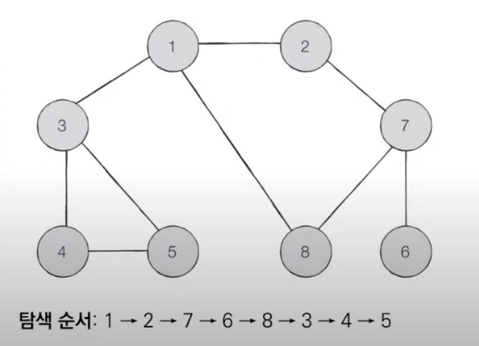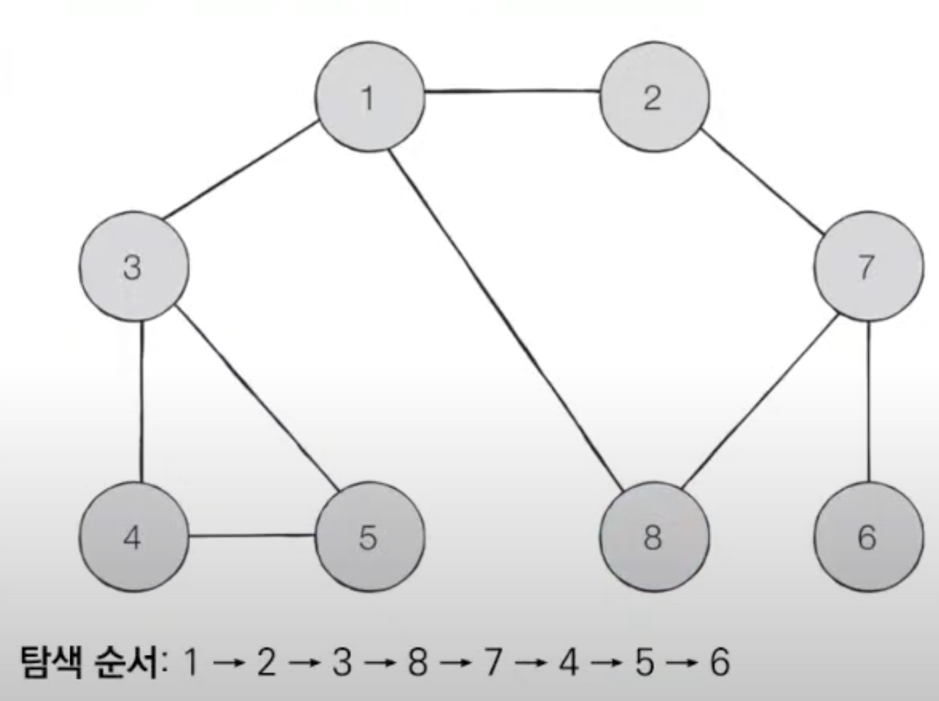 - 이 알고리즘을 구현할 때 가장 큰 차이점은 그래프 탐색의 경우 어떤 노드를 방문했었는지 여부를 반드시 검사해야한다는 것 (이를 검사하지 않을 경우 무한루프에 빠질 위험이 있음)
